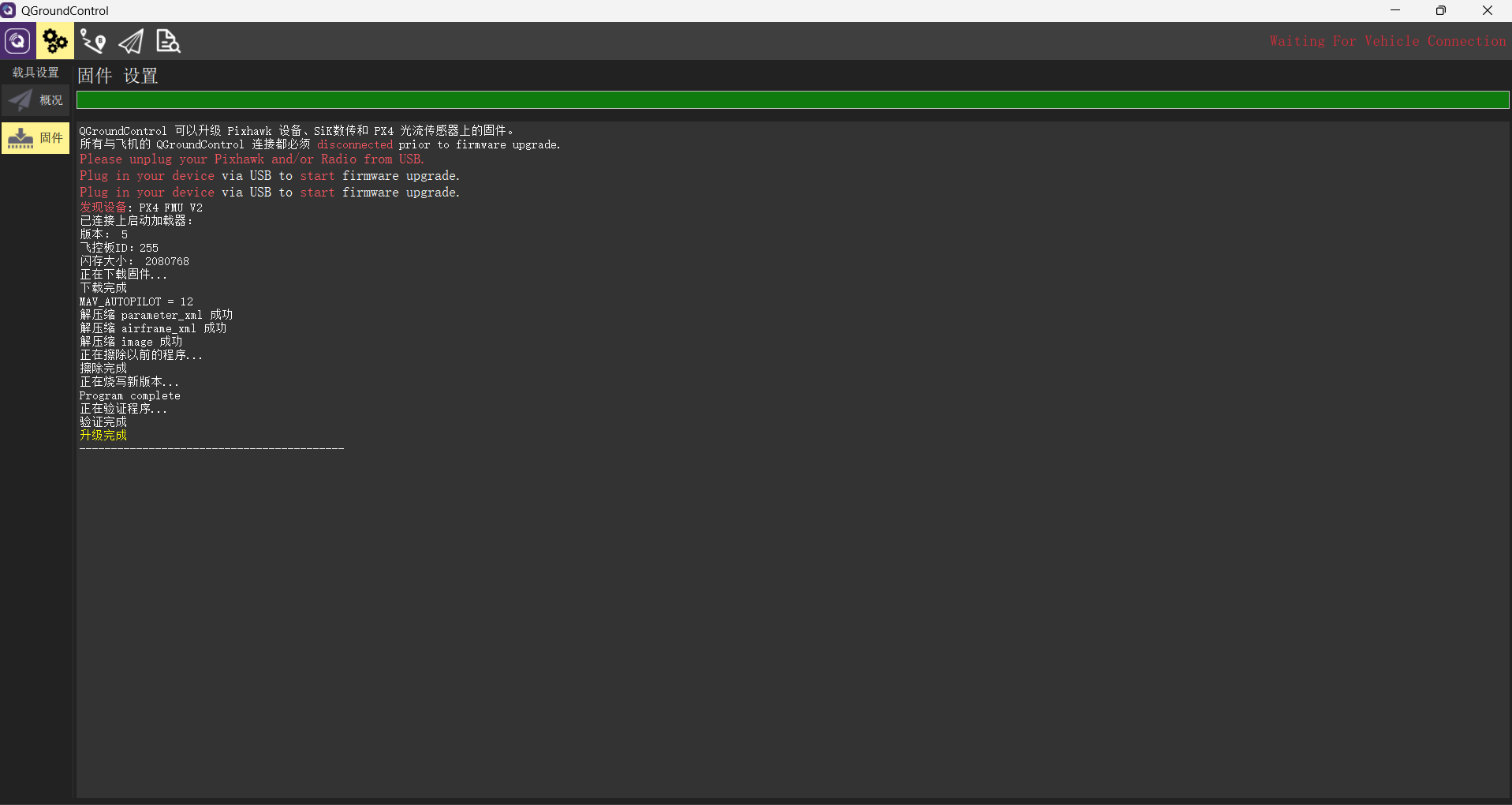 选择设置菜单下的 固件 选项卡。 断开自驾仪的直流电源,然后通过Micro USB线将自驾仪的debug口连接到计算机。点击右侧的 高级设置(Advanced settings) ,选择“Pursuit autopilot release (Cloudkernel)”选项。然后可以通过单击右上角的“OK”按钮来触发自动升级过程。当烧录的进度条完成时,会显示升级成功,参考以下图示。如果没有成功,请检查电脑是否联网,并重复以上过程。