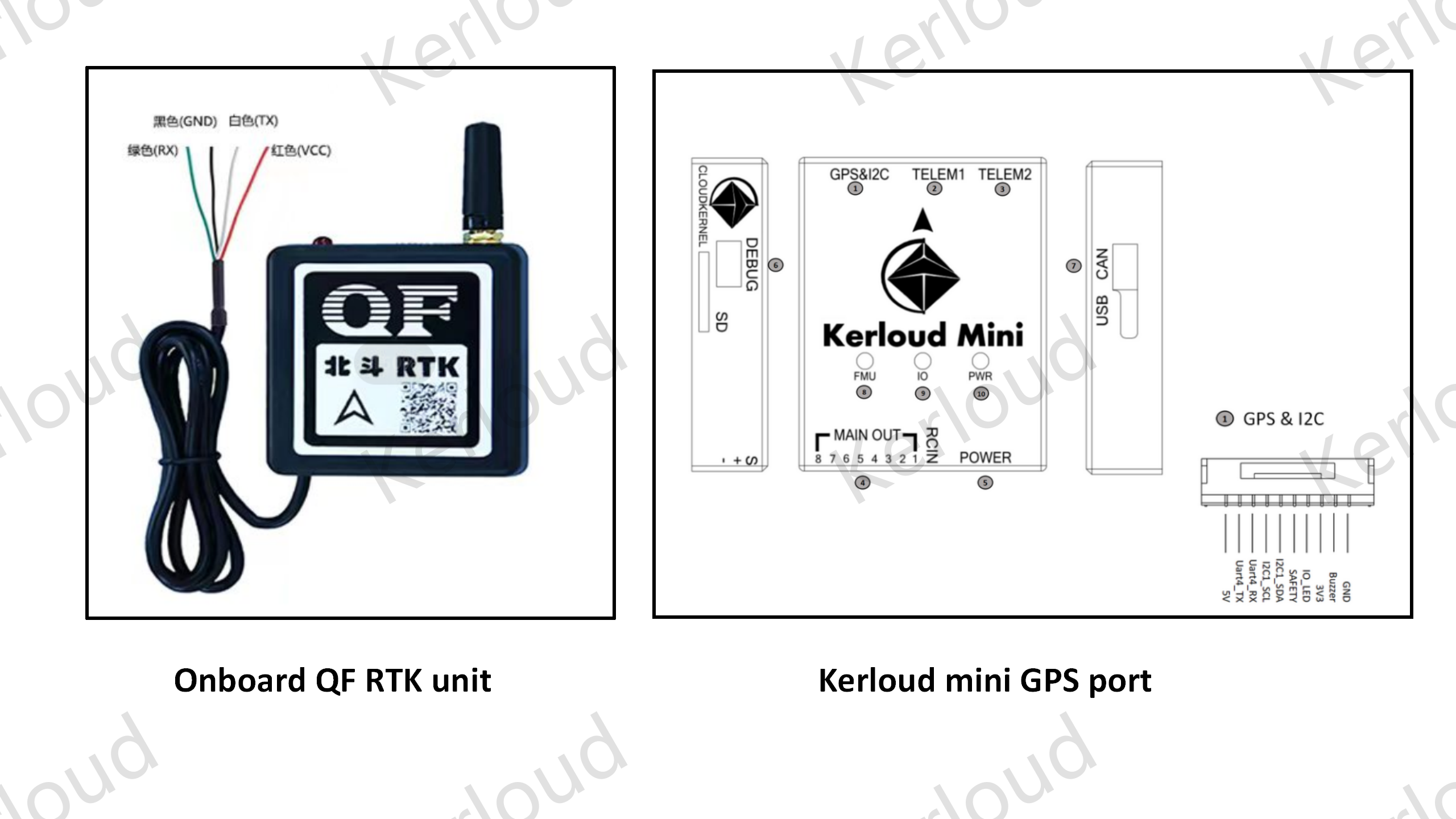 The hardware connection is quite straightforward for the onboard QF RTK unit. The unit is designed with a UART port, and it doesn’t need additional powering. The unit is connected with our Kerloud mini autopilot via the GPS port, as depicted below: